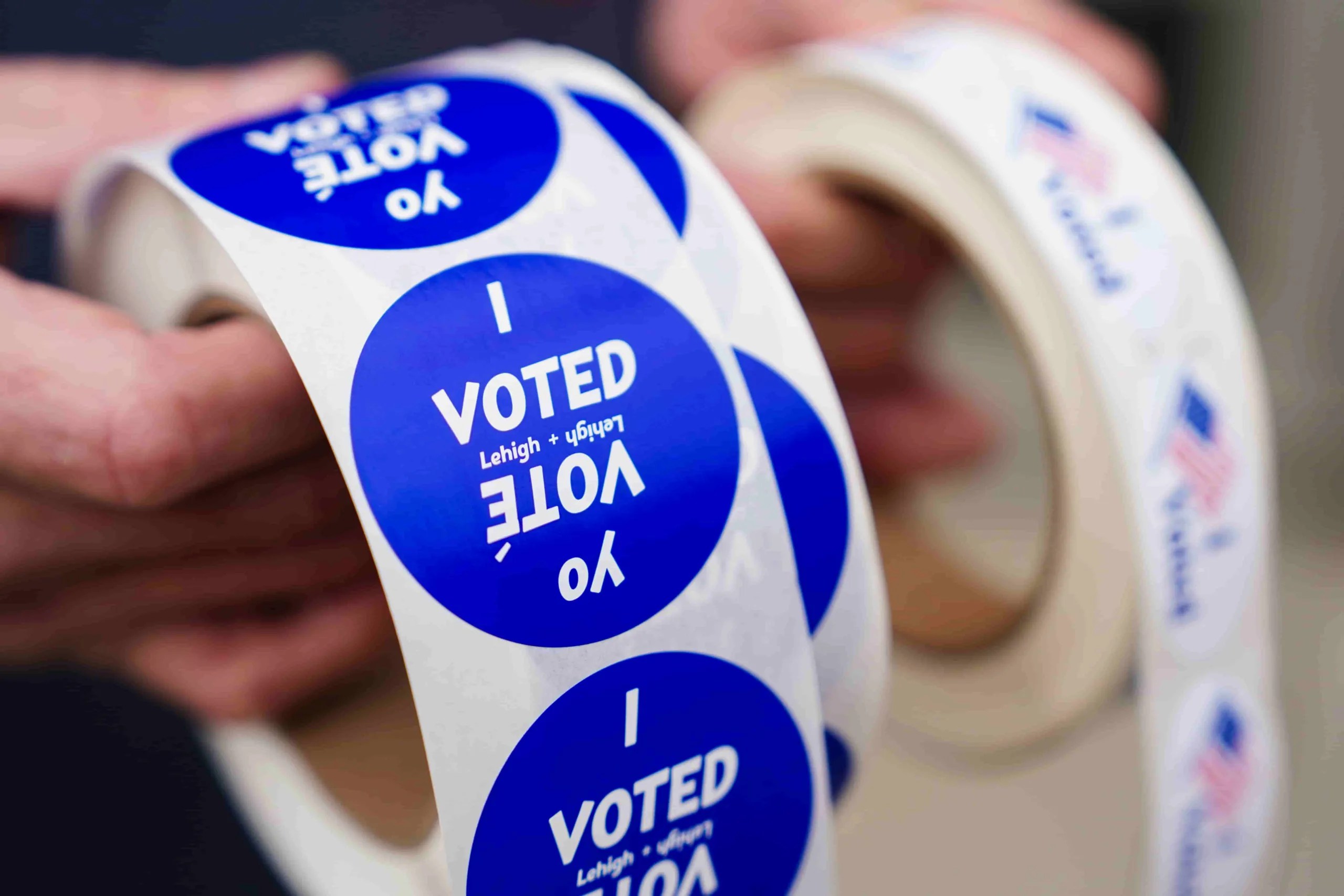 A poll worker holds voting stickers for community members on Nov. 7, 2023, at Central Elementary School in Allentown, Lehigh County, Pennsylvania. Matt Smith / For Spotlight PA