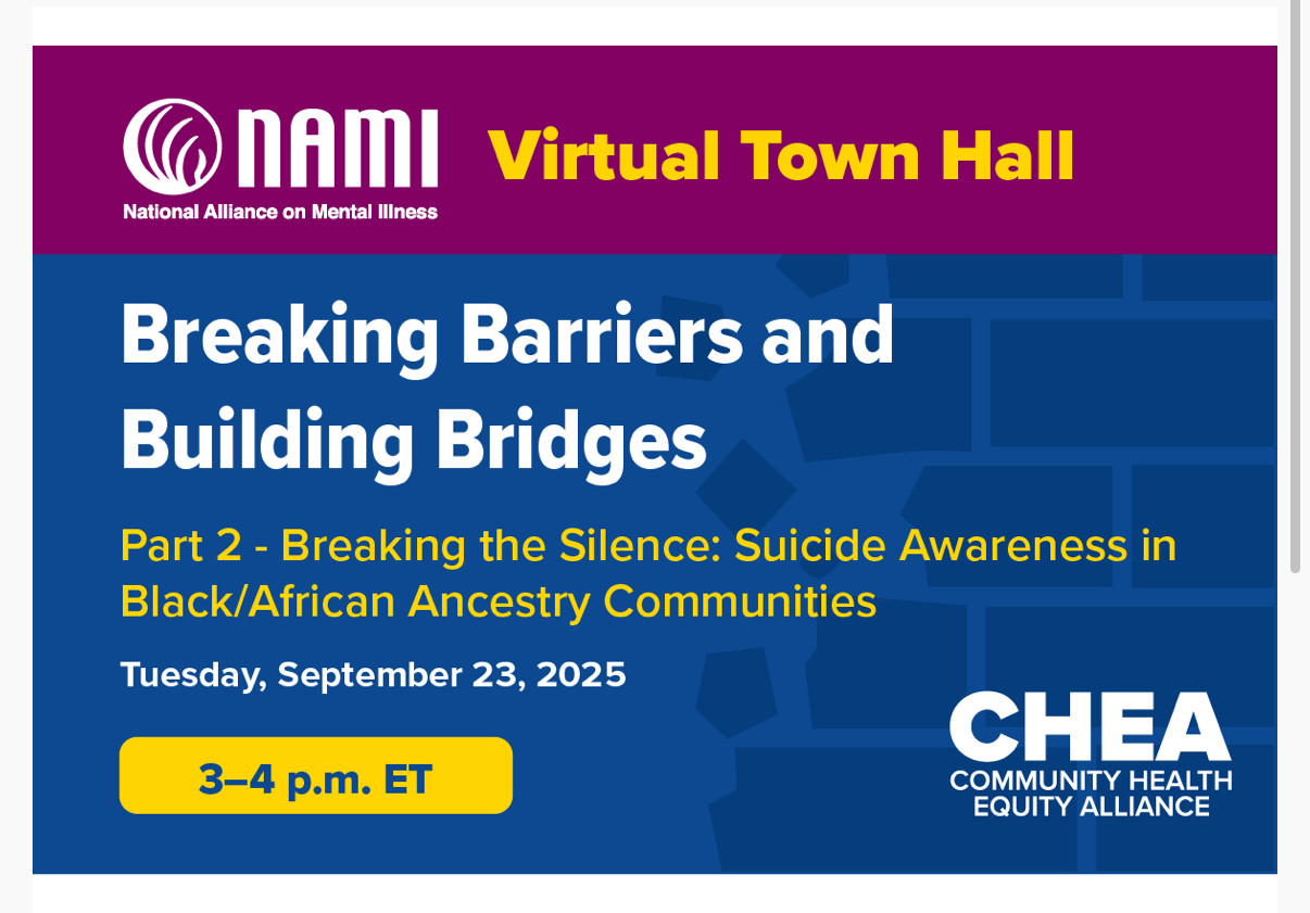 NAMI Presents: Part Two of a Virtual Town Hall Series on Suicide Awareness in Black/African Ancestry Communities Tuesday, September 23, 2025 | 3:00 – 4:00 p.m. ET Hello! Just a reminder to join us for a powerful conversation with experts who bring deep expertise, lived experience, and community-based perspectives to the issue of suicide in Black/African ancestry communities. Suicide is a growing public health crisis, particularly within Black/African ancestry communities. For Black youth ages 10 to 24, suicide was the third leading cause of death in 2021, and the suicide rate for non-Hispanic Black individuals increased by 58% between 2011… Read more »