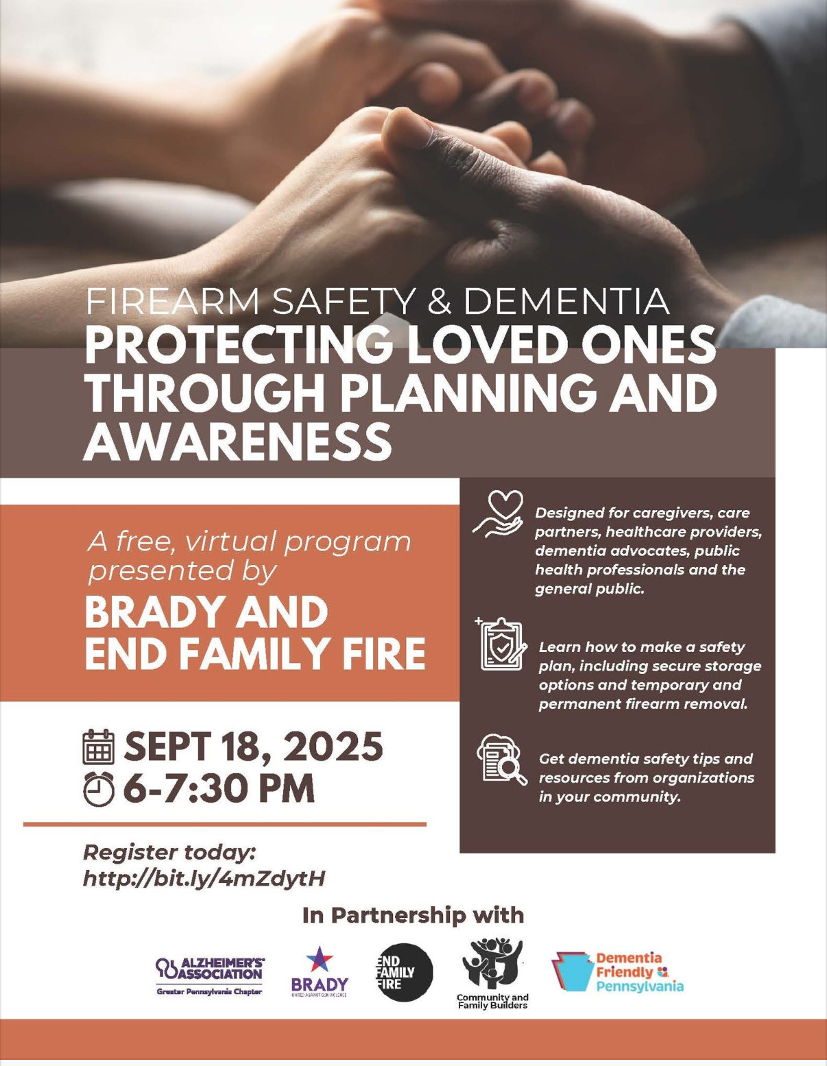 free, virtual program presented by Brady and End Family Fire as we discuss the important topic of firearm safety and dementia.