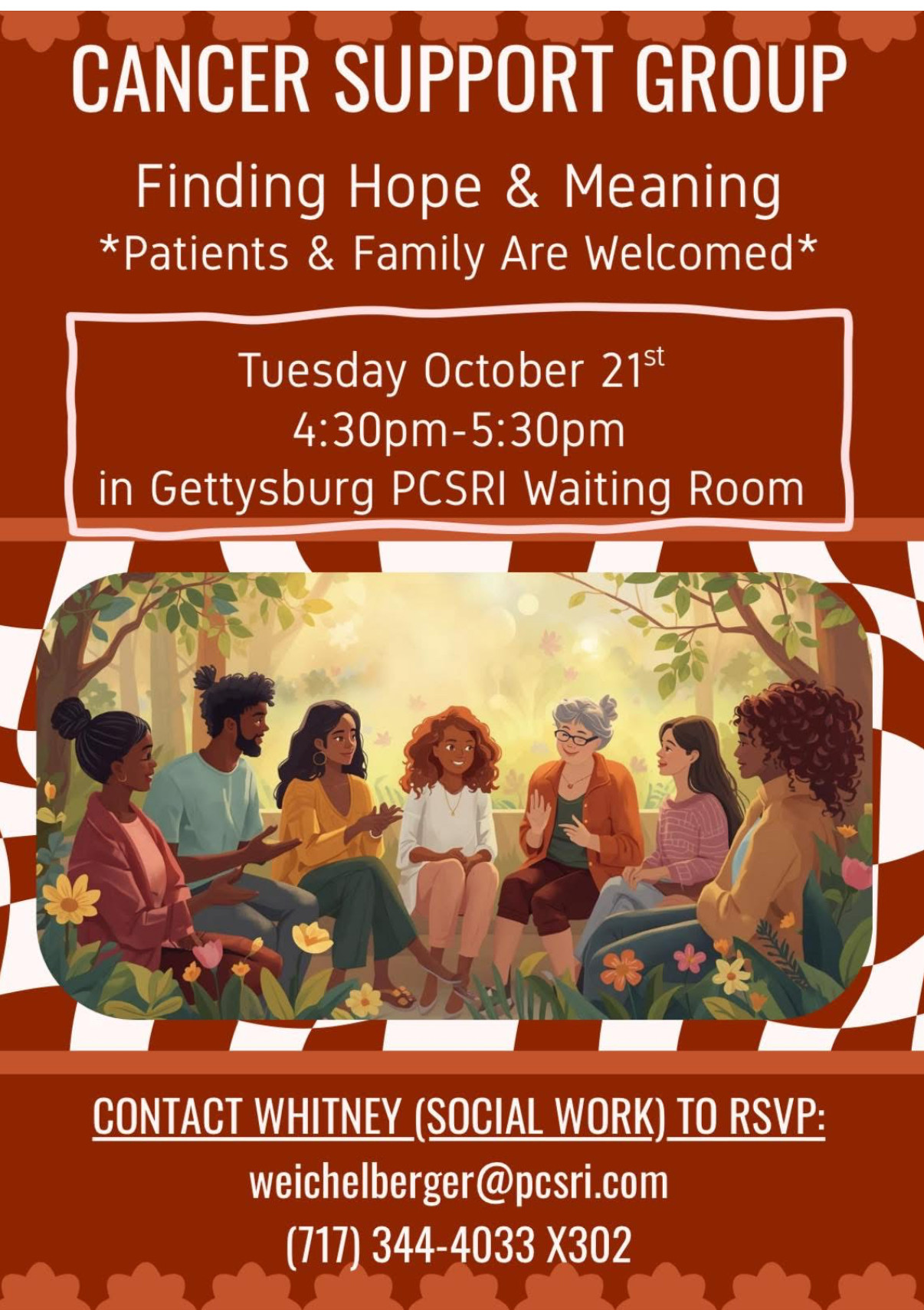 Join us on October 21 at 4:30-5:30 for a cancer support group! Anyone (cancer patients or survivors) are welcome to attend even if they aren’t a patient of PA Cancer Specialists. Families welcome!