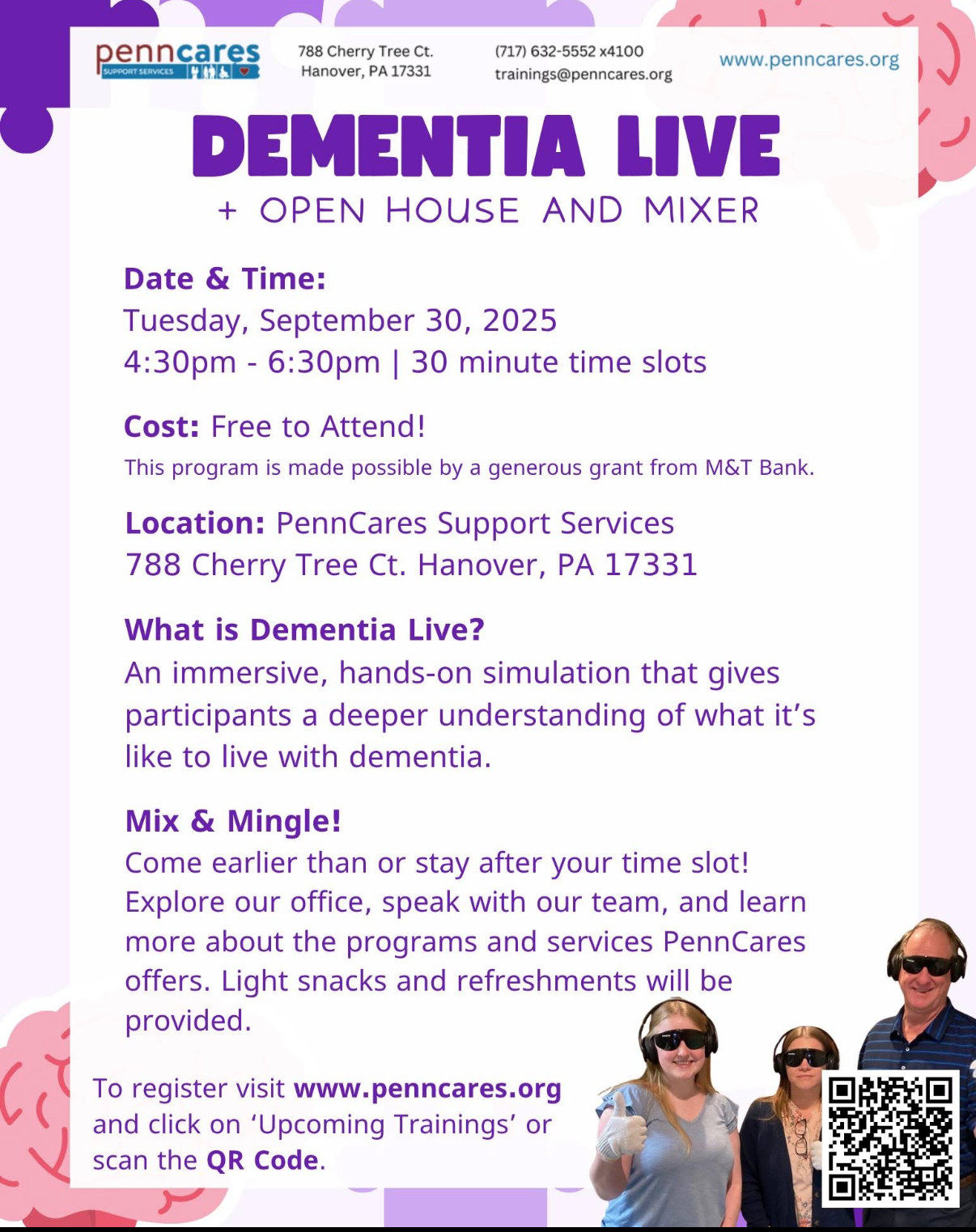 There are still a few spots open for our Dementia Live + Open House Mixer 🧠✨ 📅 Tuesday, September 30, 2025 🕟 4:30 PM – 6:30 PM | 30 minute time slots 📍 PennCares Office | 788 Cherry Tree Ct. Hanover, PA This free event is your chance to experience Dementia Live, an eye-opening simulation that helps you better understand what it’s like to live with dementia. Come earlier than or stay after your time slot! Explore our office, connect with our team, and learn more about the programs and services PennCares offers. Light snacks and refreshments will be provided.… Read more »